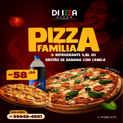 1 Pizza família (até 2 sabores) + 1 brotão doce + refrigerante